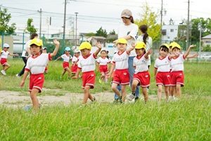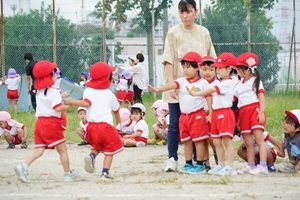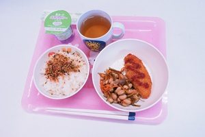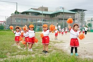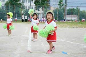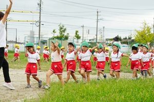 お遊戯の練習をしました。 年中組さんは開会式の入場行進から,始めて遊戯の練習をしました。すすぐしくなったので,外での活動が気持ちよいですね。 うめ組,年少組さんは遊戯と競技の練習をしました。ポンポンがきれいですね。競技も仲良くがんばりました。 給食は魚フライと煮豆でした。ご飯には鰹節のふりかけがのっていました。和食でしたね。ブドウセリーも冷たくておいしかったです。