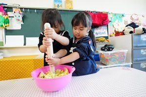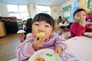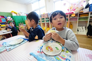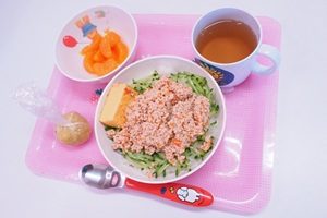 お芋のお菓子をつくりました。 今日は先日,みんなで掘ったお芋をお菓子にして食べました。みんなで交代で潰してラップに包んで茶巾絞りにしました。甘くて柔らかくておいしかったです。たくさんおかわりしました。 給食はそぼろご飯でした。卵焼きもついていました。キュウリとそぼろがマッチしてあっさりおいしいご飯でした。