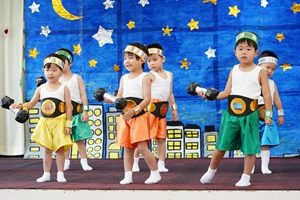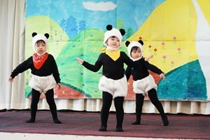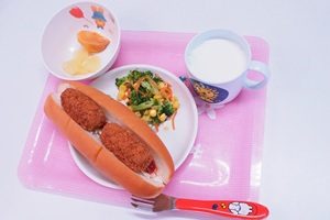 お遊戯会のリハーサルをしました。 今日はお遊戯会のリハーサルをしました。本番と同じ衣装で,みんなの前で踊りました。色々な出し物があって楽しかったですね。これから本番に向けて技を磨いていきましょう。 給食はメンチカツサンドでした。みんな大好きですね。温野菜のサラダのトウモロコシは幼稚園でとれたものです。デザートの柿も幼稚園でとれたものです。