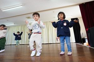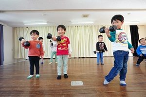 遊戯室では交代でお遊戯会の練習をしています。ダンスはみんな上手ですね。ダンベルを上げているクラスもありました。