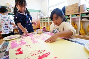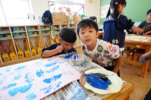 園外保育で拾ってきた葉っぱなどを使って,スタンプ遊びをしました。これを使って製作をしていきます。