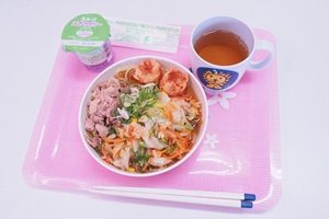 給食は野菜もお肉もたっぷりのスタミナラーメンでした。揚げシュウマイも2個のっています。ブドウゼリーも冷たくておいしかったです。