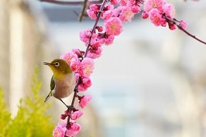 園庭の梅の木にメジロが来ました。花の蜜をいっぱい食べていました。