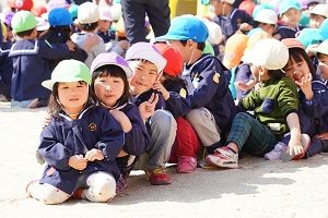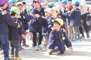 今日の朝は,年長組さんといっしょに遊ぶ最後の時間になりました。みんなで,じゃんけん列車をしました。じゃんけんをして,負けたら後ろにどんどんつながっていく遊びです。梅組さんから年長組さんまで,全員で楽しく遊びました。