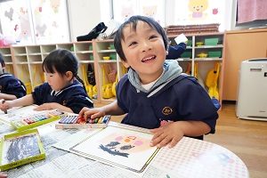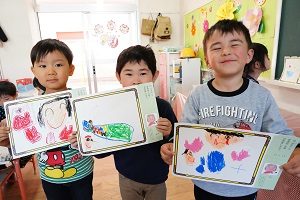 年少組さんは,思い出に残っていることを絵にかきました。行事の様子や,先生の顔など楽しかった思い出を絵にしました。