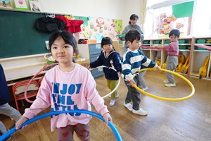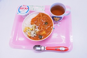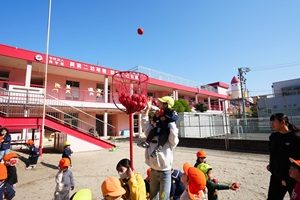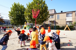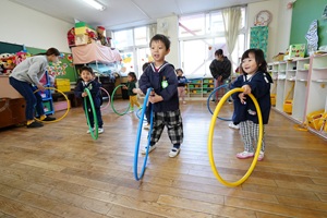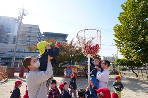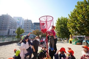 玉入れをしました。 うめ組,年少組さんはリトミックがありました。今日はフープを使って遊びました。転がしたり入ったり色々な遊びをしました。 玉入れもしました。先生に高く上げてもらってたくさん入りましたね。うめ組さんは初めてでしたが楽しかったですね。 給食はカレーライスでした。カボチャが入っていて甘口です。みんな大好きでおかわりをしていました。
