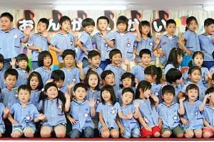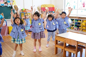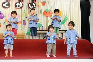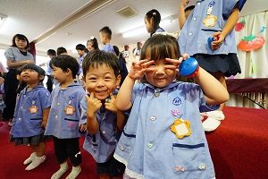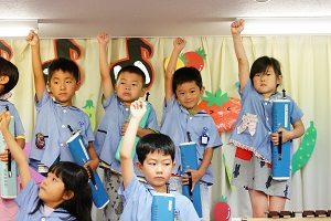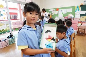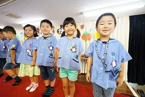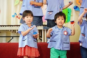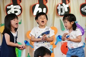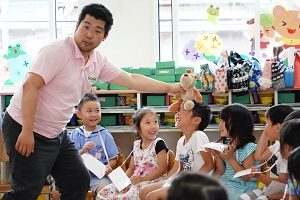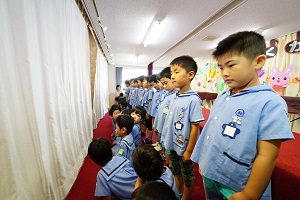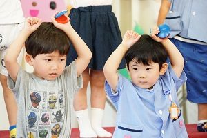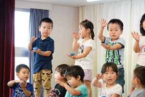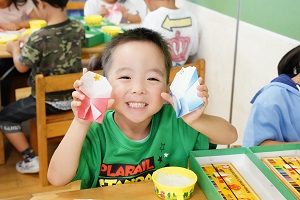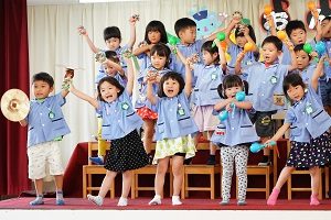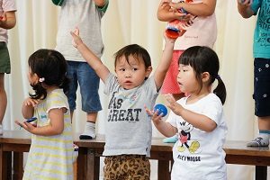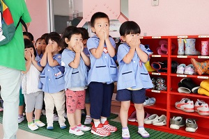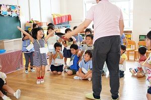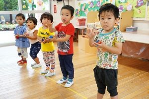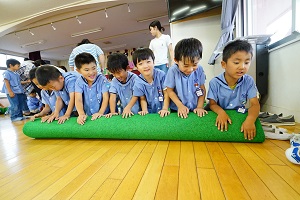 年中,年長組さんは英語レッスンがありました。今回は,in,on,under,behindを人形を使って練習しました。最初は分からなくても,だんだん分かってきましたね。