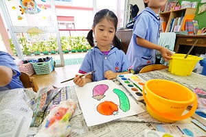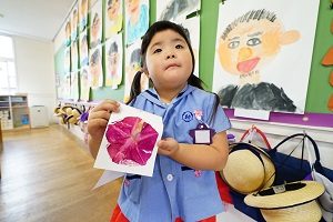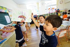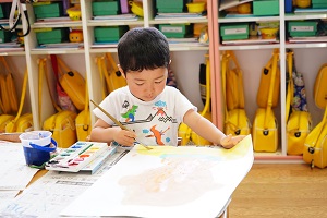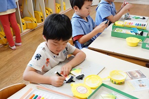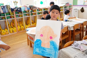 年長組さんは,お父さんの似顔絵に取り組んでいます。まず,大きく顔の輪郭をかきました。絵の具が乾いたら,目や口,鼻をかきます。