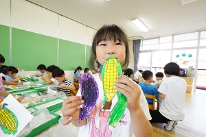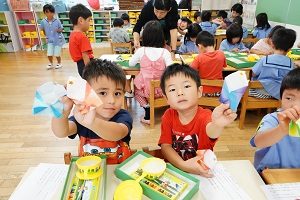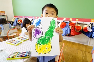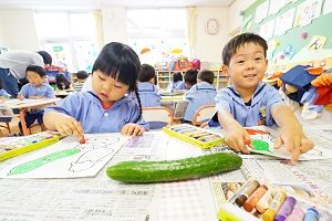 今日は,七夕の飾りを作りました。年少組さんはクレヨンでナスとキュウリとトマトをぬりました。今朝も本物のキュウリが10本くらいとれたのでそれを見てぬりました。年長組さんは絵の具でぬりました。水彩絵の色がきれいです。年中組さんはクレヨンでぬって,切り取りました。