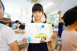 梅雨入り宣言がでると,良い天気になるのは毎年のことですね。でも,今日は雨の絵をかきました。大粒の雨や色とりどりの雨をかきました。こんな雨だと楽しいですね。