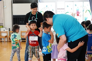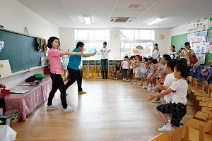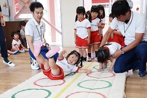 年中組,年長組さんは英語レッスンの見学会もありました。一見,日本人みたいな先生ですが,オーストラリア生まれ,オーストラリア育ちのオーストラリアの人です。