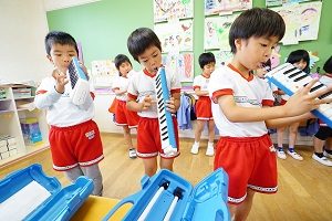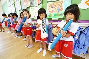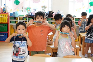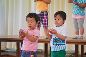 いよいよ今月は,音楽会があるので,遊戯室で舞台に立って演奏しています。梅組さん,年少組さんは舞台に立つのが初めてなので,緊張しますね。
