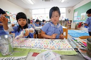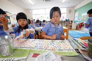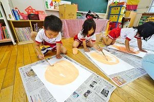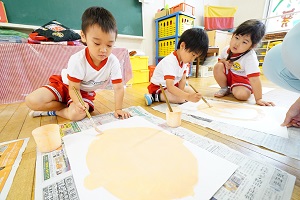年長組さんは,スパッタリングをしました。紙の上に丸や三角台紙を置いて,その上からブラシを使って,絵の具の細かいしぶきをかけて,台紙を外すと,丸や三角の模様ができました。色が混ざるときれいでしたね。