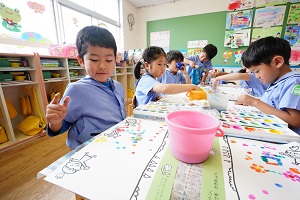 年少組さんは,カエルの住んでいる池をつくりました。カエルやオタマジャクシを泳がせて楽しい池ができました。