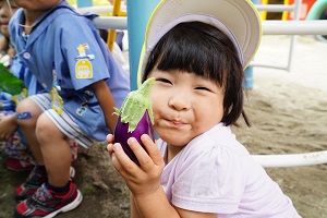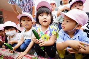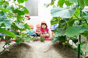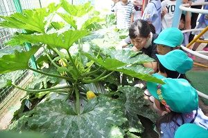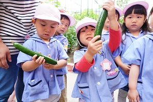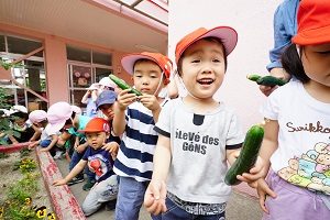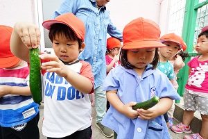 幼稚園の畑でキュウリがなりました。いつもより早く収穫できました。早速,給食に出してもらって食べました。新鮮でとてもおいしかったです。