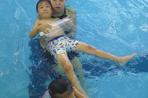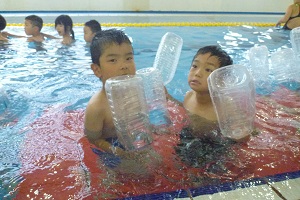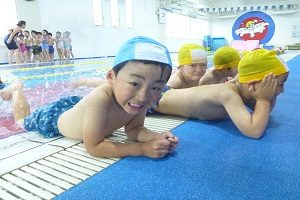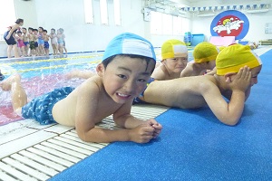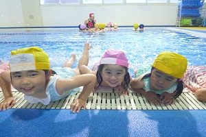 年中組さんは,名古屋スイミングで初めて泳ぎました。バタ足の練習をしたり,水を顔にかけたりしました。広くてきれいなプールです。