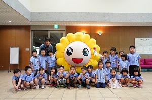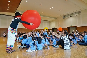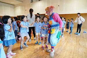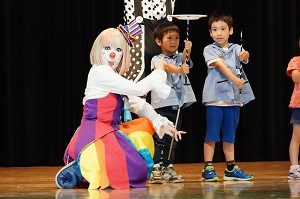 今日は,南区役所で南区年長組まつりがありました。たくさんのピエロが色々な曲芸を見せてくれました。いっしょに皿回しもしました。南区のマスコットのミオーとも遊ぶことができました。