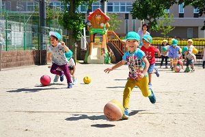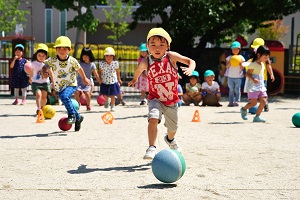 年中組さんは,サッカーを体験しました。カワイサッカー教室の先生が特別に来てくれて,ドリブルやシュートをしました。手を使わないでボールを扱うのは難しかったですね。