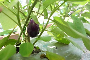 今日はナスがなりました。紫色がとてもきれいです。キュウリと違って,すべすべでしたね。1個しかとれなかったので,給食にはまだ出ませんが,楽しみにしていてください。