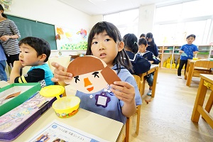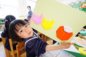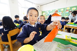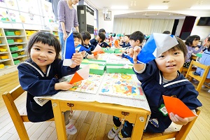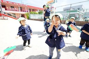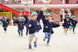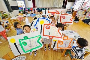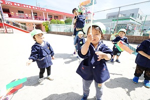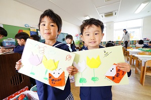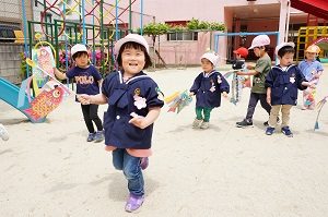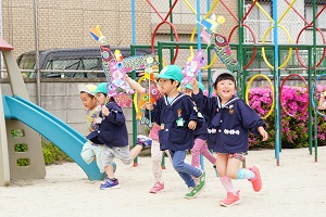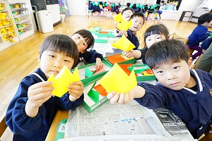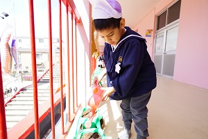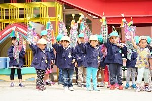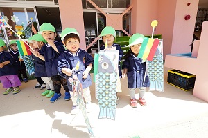 今日は,自分で作った鯉のぼりを園庭で泳がせました。高く上げて走ると,元気に泳ぎました。家に持って帰ったら,高いところに飾って,泳がせてあげてください。
