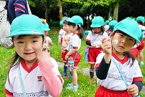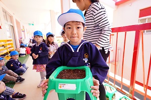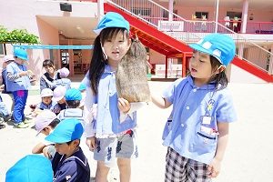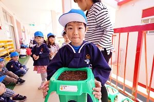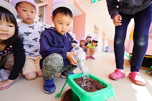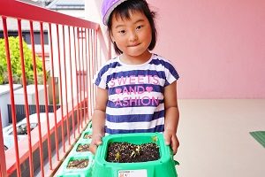 年長組さんは,朝顔を植えました。先生から説明を聞いて,一人5個ずつ種をもらいました。早速,水やりをしました。これから毎日水をあげましょう。早く花が咲くと良いですね。