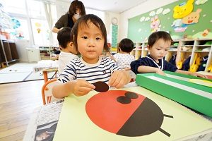 梅組さんはテントウムシの製作をしました。先生が切ったテントウムシの台紙に,模様を貼ります。かわいいテントウムシができましたね。