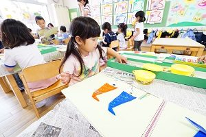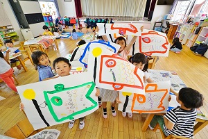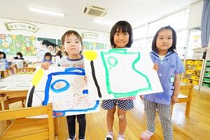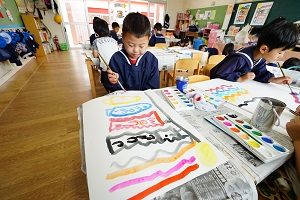 年中組さんは鯉のぼりをかいています。絵の具で大きな紙にいっぱいにかきました。元気があって良いですね。