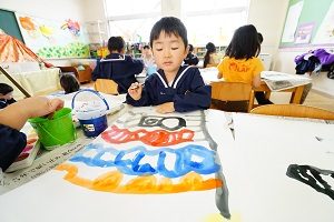 年長組さんは,絵の具で鯉のぼりの絵をかきました。絵の具で輪郭を描くのは慣れていないので,少し難しかったです。大きな紙に力強い鯉をかくことができました。