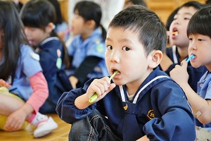 今日は,歯みがき指導がありました。最初に紙芝居や人形劇を見て,それから歯ブラシの正しい使い方を学びました。これからは,歯の表も裏もピカピカですね。