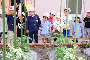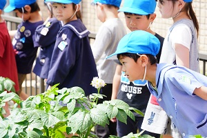 幼稚園の畑の作物がすくすくに生長しています。ジャガイモは白い花を,トマトは黄色の花を咲かせました。今年は1本も枯れずに元気です。早く食べたいですね。