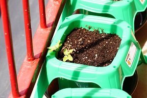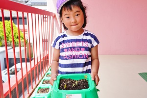 年長組さんが,先週植えた朝顔が芽を出しました。これからも,毎日水をあげましょう。