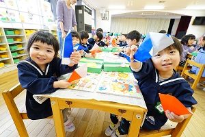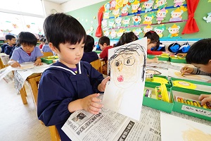 年長組さんは,お母さんの顔を切り紙で作りました。髪の毛の形や目の形を工夫しました。母の日にプレゼントします。