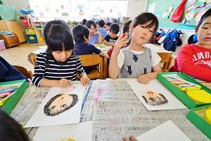 年長組さんは,お母さんの絵をかきました。髪の毛や目の形などの特徴を思い出しながらかきました。母の日のプレゼントにしますから楽しみにしていてください。