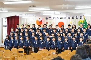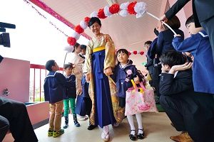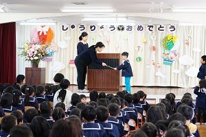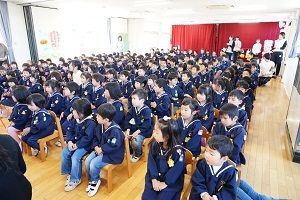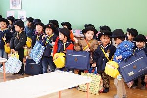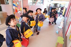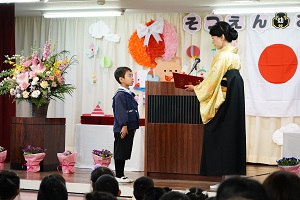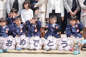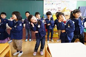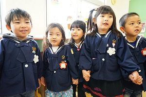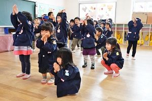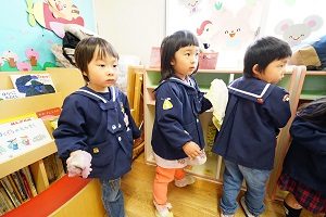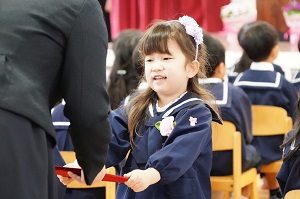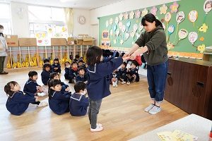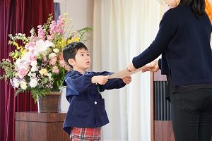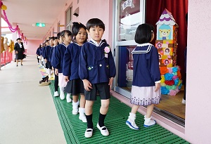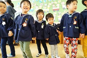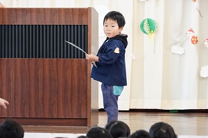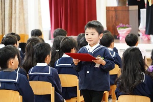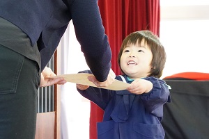 明日は,平成29年度の修了式です。年少組さんも修了証書をもらう練習をしました。じょうずにできましたね。本番は,園長先生から舞台の上で一人ずつもらいます。少し緊張しますね。