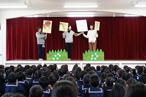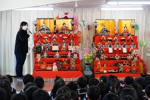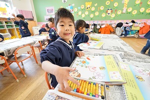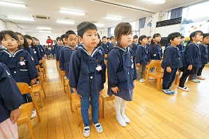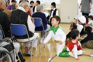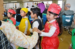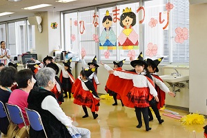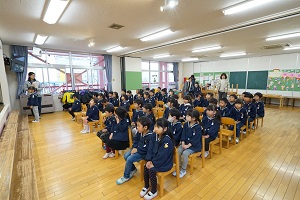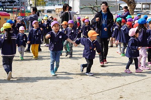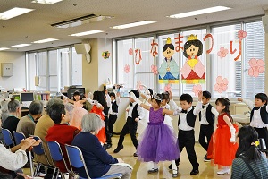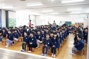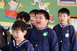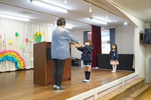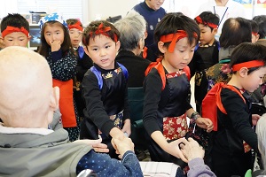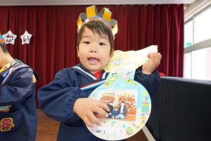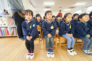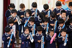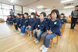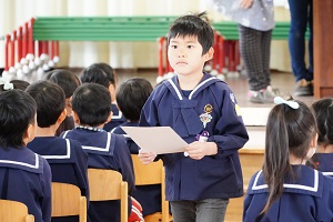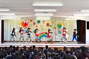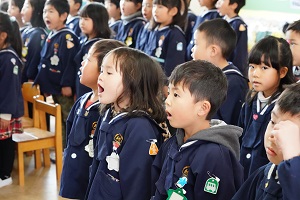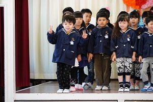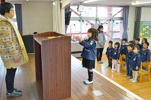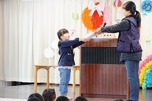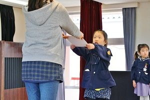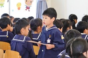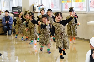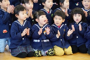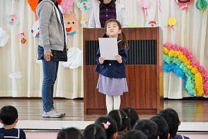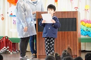 今日は,遊戯室で年長組さんへのお別れ会が行われました。まず始めに,年中組さんからお別れの言葉とメロディオンの演奏がありました。次に年少組さんが,お別れの言葉と歌を歌ってくれました。年長組さんは,一人ずつ楽しかった思い出を話し,全員で歌を歌いました。最後に,ダンスを習っている人たちがダンスが見せてくれました。心こもったお別れ会でした。