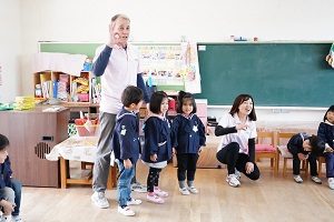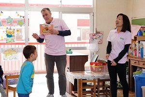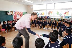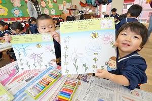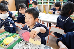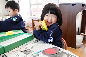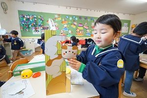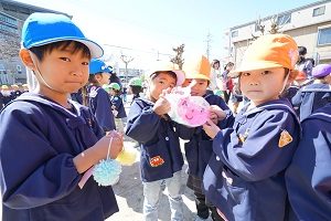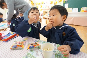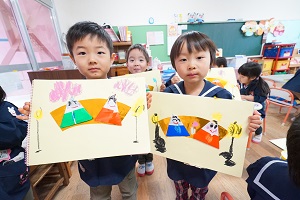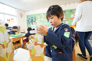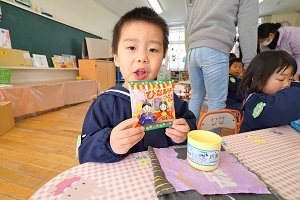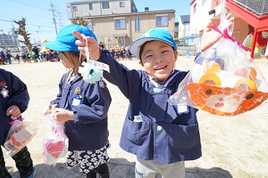 遊戯室の後は,園庭でプレゼントの交換をしました。今日のために,それぞれ準備してきました。年少組さんはペン立て,年中組さんは写真立て,年長組さんはポンポンの飾りです。大切にしてくださいね。