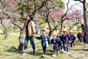 今日はとても良い天気になりましたね。梅組,年少組さんがお別れ遠足で,大池公園に行きました。梅の花が満開でした。芝生で滑って遊んだり,動物を見たり,遊具で遊んだりしました。クジャクが大きな羽を広げて見せてくれましたね。幼稚園にない遊具でもいっぱい遊びました。オンラインアルバムでも見てください。
