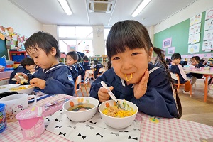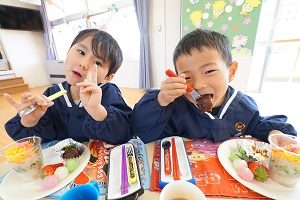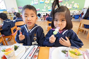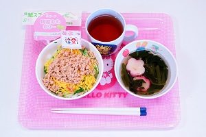 給食もスペシャルメニューでした。ちらし寿司に肉団子,お団子にイチゴもついていました。みんなで一緒においしく食べました。