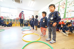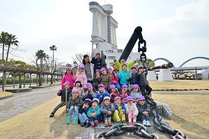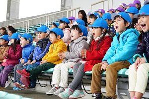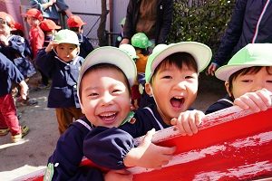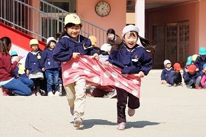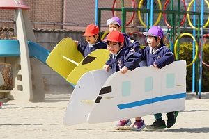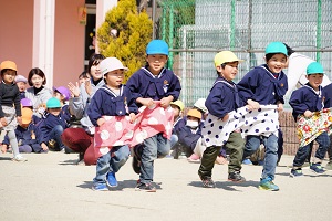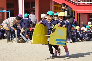 午後からは,みんなで新幹線で競争をしました。年少組さんと年長組,年中組さんがチームになって競争です。風で新幹線が飛ばされそうになって大変でした。でも,とても楽しかったです。