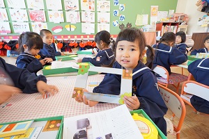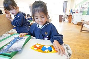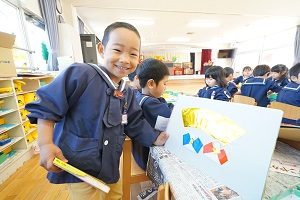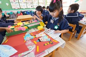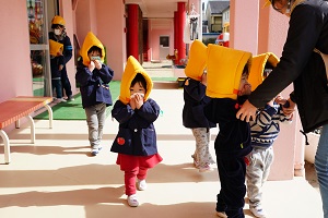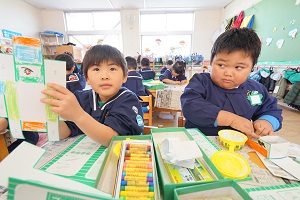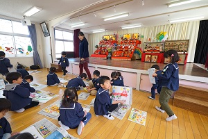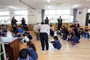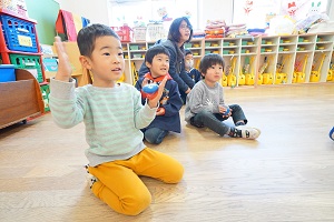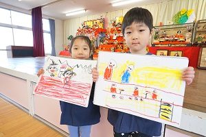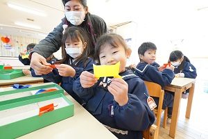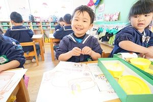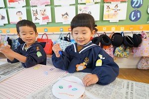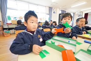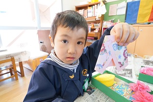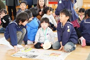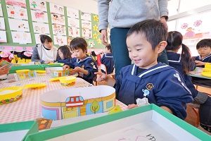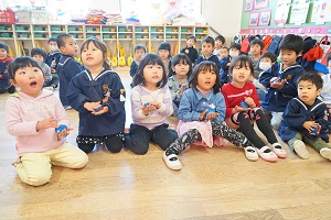 今日は,来年度入園するお友だちがやって来ました。年長組のお兄さん,お姉さんと一緒に遊んだり,製作をしたりしました。先生のペープサートも見ました。春になったら,幼稚園に来てくださいね。