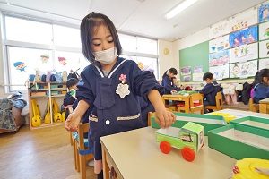年中組さんはトラックの製作をしました。思い思いの色を塗り,先生に車輪をつけてもらいました。コロコロよく走ります。色々なものを積み込んでみましょう。