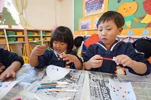 年長組さんは折り紙で,鬼の製作をしました。折り紙にはクレヨンで色をつけて,台紙に貼ります。カラフルな虎のパンツをかいていましたね。