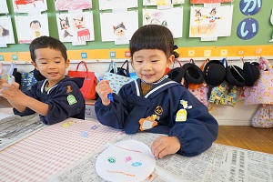 年少組さんはおひな様を作っています。サインペンで色々な模様をかきました。どんなおひな様になるのかはお楽しみです。