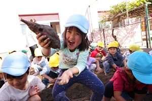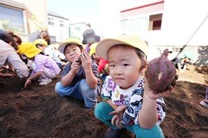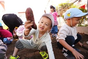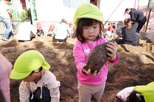 今日は芋掘りをしました。今年はいつになく不作でした。でも,きれいな形のお芋が収穫できました。幼稚園でお菓子にして食べましょう。