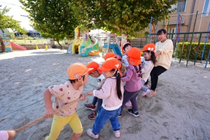 今日は地震が起きた想定で,防災訓練を行いました。園庭で遊んでいる人もその場でダンゴムシのポーズをしました。安心帽をかぶって,園庭に全員避難しました。給食も避難していることを想定して,食べました。静かに行動できましたね。