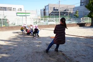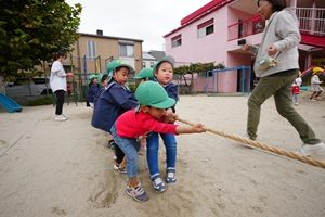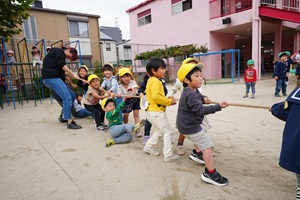 午後から年少組さんは綱引きをしました。先生も一緒にやりました。先生対クラス全員の勝負もしました。先生一人では,クラス全員には勝てませんでした。