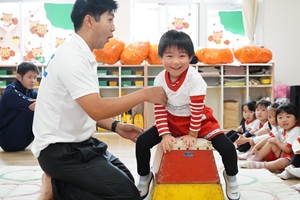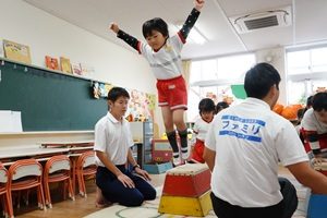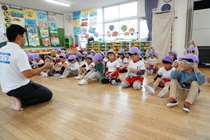 今日は年少組さんと年長組さんで体育指導がありました。年少組さんは跳び箱,年長組さんは縄跳びをしました。雨のため見学会ができなかったのが残念でした。