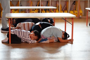 今日は津波の避難訓練をしました。まず,教室で,机の下でダンゴムシになって,それから屋上に避難しました。今年は,とても素早く避難できましたね。