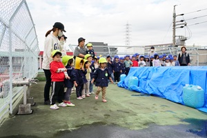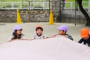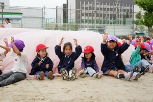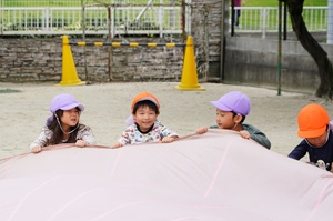 午後から年少組さんは,年長組さんと一緒にバルーンをしました。運動会で年長組さんがきれいに演技していましたね。一緒にやれて良かったです。