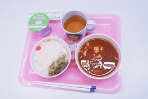 給食は麻婆丼とわかめスープでした。甘口の麻婆豆腐です。寒くなってくると温かいものがおいしいです。